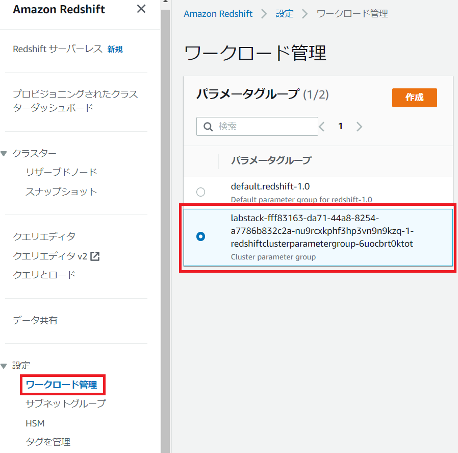 パラメータグループを指定し、ワークロード管理の設定を表示